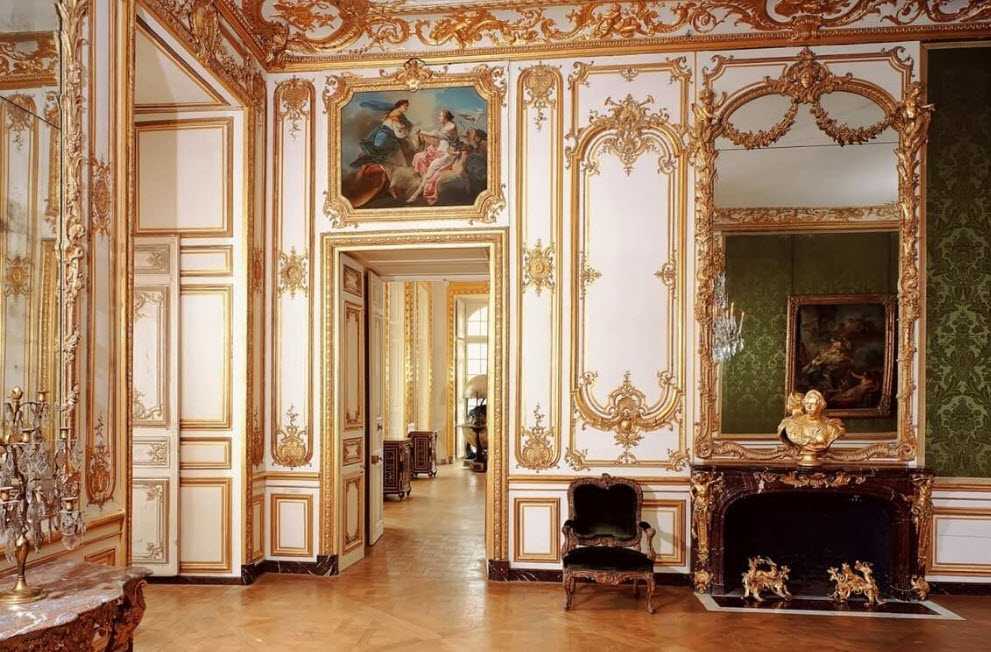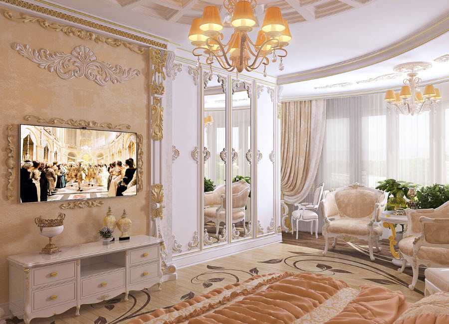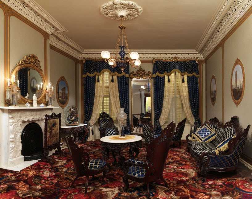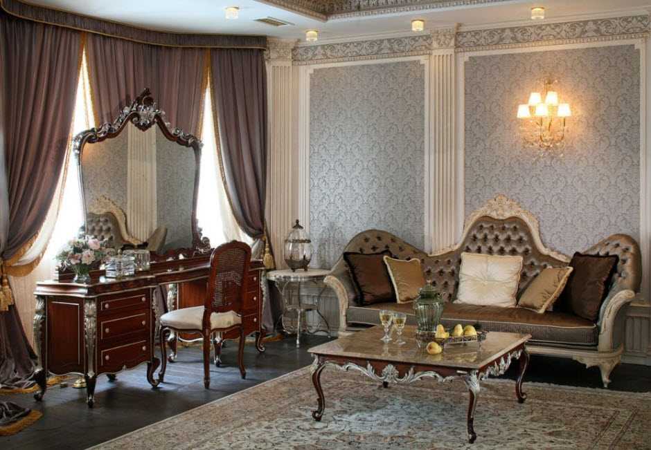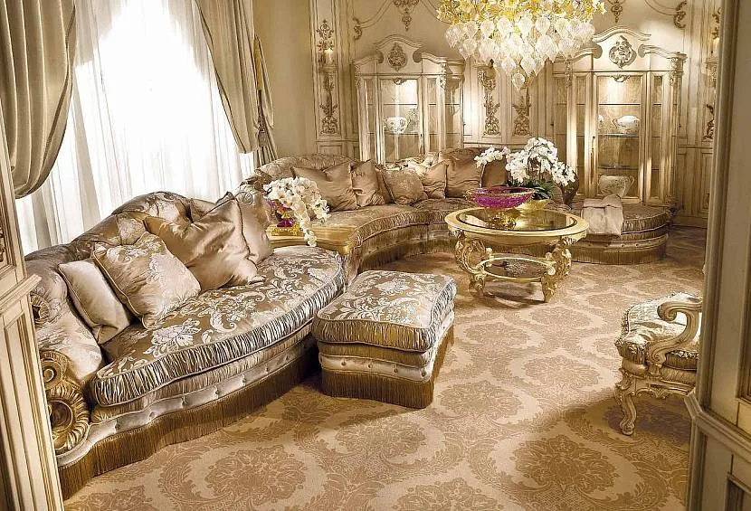 Ткани должны быть дорогими; также важно, чтобы в оформлении было много позолоты – это лучший способ продемонстрировать богатство и роскошь обстановки. Оконные и дверные проемы тоже можно украсить позолоченной резьбой
