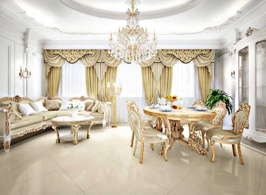 На фото просторная гостиная в стиле барокко, где окна и их текстиль служат главным акцентом комнаты и находятся в гармонии с другими цветами интерьера.