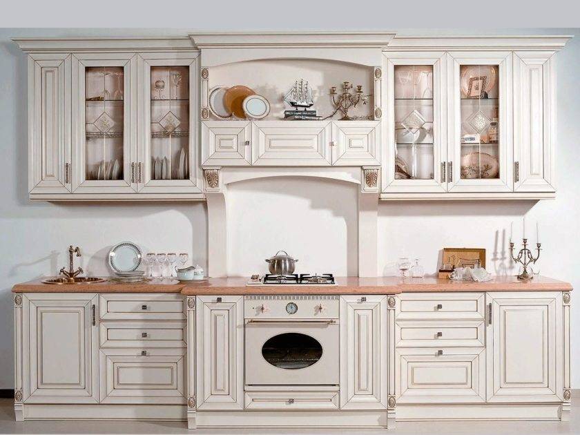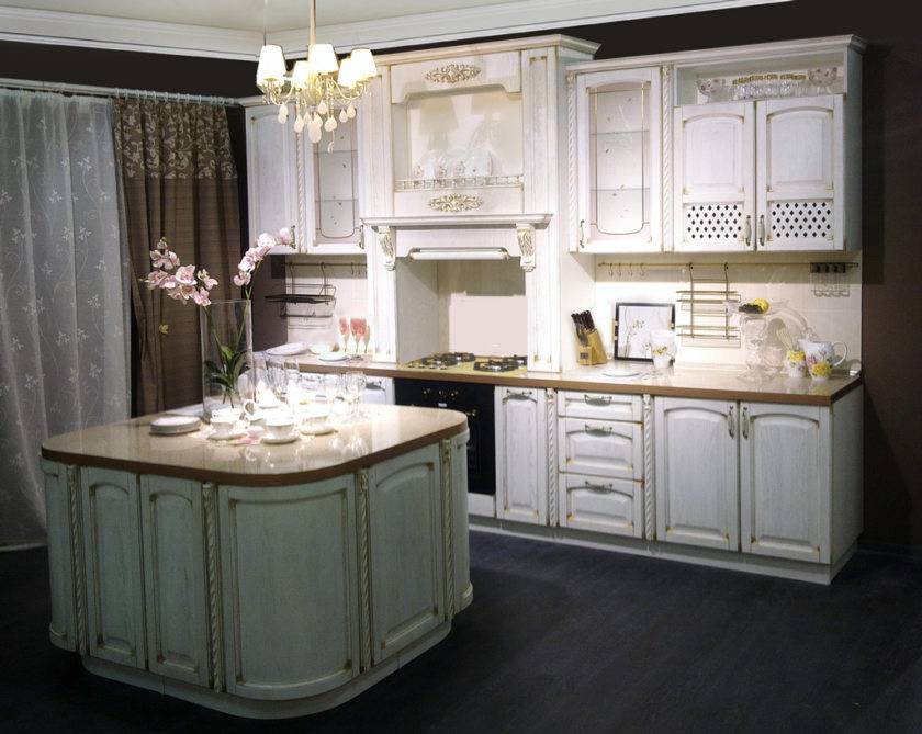 Кухонные шкафы имеют вид сервантов, украшенных причудливой резьбой, со стеклянными дверцами. Прозрачное стекло украшает ювелирная гравировка. За стеклянными дверцами, как на выставке, демонстрируется дорогая фарфоровая посуда, белоснежная или украшенная росписью. Выкатные элементы и доводчики на дверцах делают использование мебели удобным и бесшумным.
