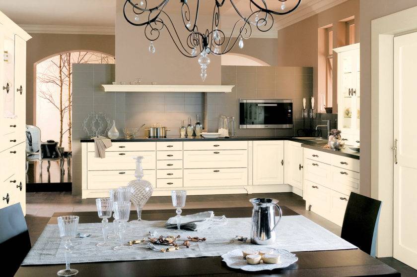 Давайте для начала разберемся, в помещениях с какой квадратурой будет уместна неоклассическая кухня. Вообще, такой интерьер наиболее выигрышно смотрится в тех кухнях, которые были объединены с гостиными. Но благодаря своей светлой цветовой гамме неоклассика может быть применена даже в хрущевских кухнях. Только здесь следует учитывать, что акценты темных тонов нужно расставлять в минимальном количестве, например, обрамить темным текстилем только оконные проемы. Сама по себе концепция выбранного стилистического решения заключается в следующих позициях: