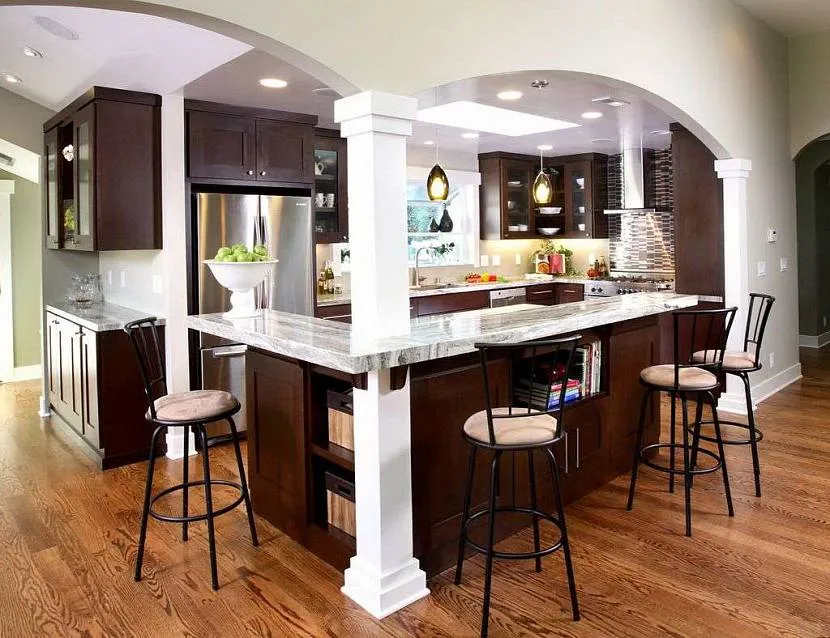 Не следует забывать о декорировании арочных проемов. При установке арки на большой площади можно дополнить ее перегородкой, которая сможет выполнять функцию барной стойки или местом для расположения различных аксессуаров. Такая перегородка гармонично впишется в классический стиль вашей кухни. Чтобы проем соответствовал кухонному интерьеру, рекомендуется декорировать его в одном стиле с кухонной мебелью или столешницей.