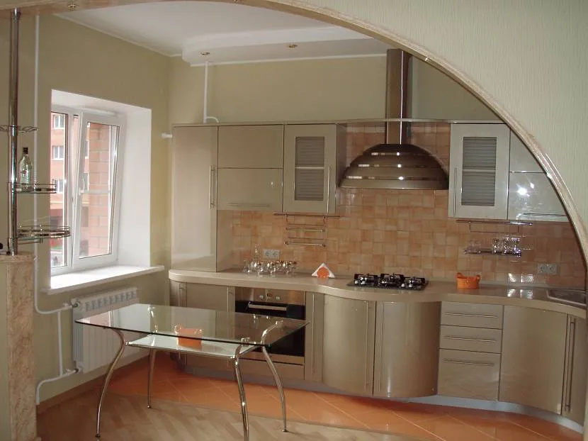 Выбор описываемого решения преследует свои цели. Если убрать входные двери и расширить проем, скруглить сверху его свод, комната станет зрительно больше. Это актуально для квартир, где кухни очень маленькие и в них трудно развернуться.