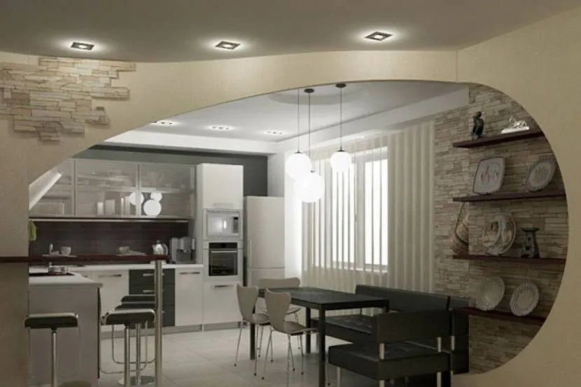 В тренде перепланировка с объединением разных функциональных блоков квартиры. Для осуществления этой идеи частично или полностью сносится стена между кухонным и жилым блоками. В образовавшийся проем встраивается модуль из ГКЛ, дополненный кирпичной кладкой, в который включены разные элементы – фигурная перегородка, большая фантазийная арка или конструкция в романтическом стиле с барной стойкой.