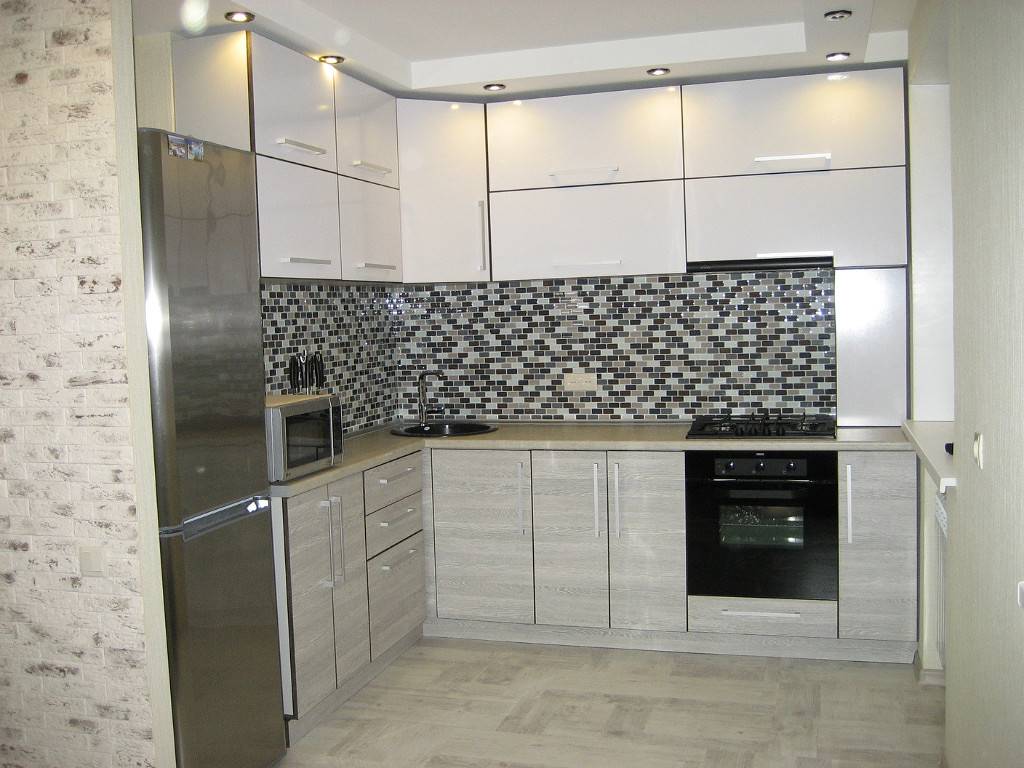 - Наиболее эффективно экономить свободное пространство позволяет Г-образная конфигурация кухонного гарнитура. При этом угловой сегмент желательно выполнить в виде трапеции – так шкафы будут более вместительными. Здесь получится расположить мойку или плиту со встроенным духовым шкафом.