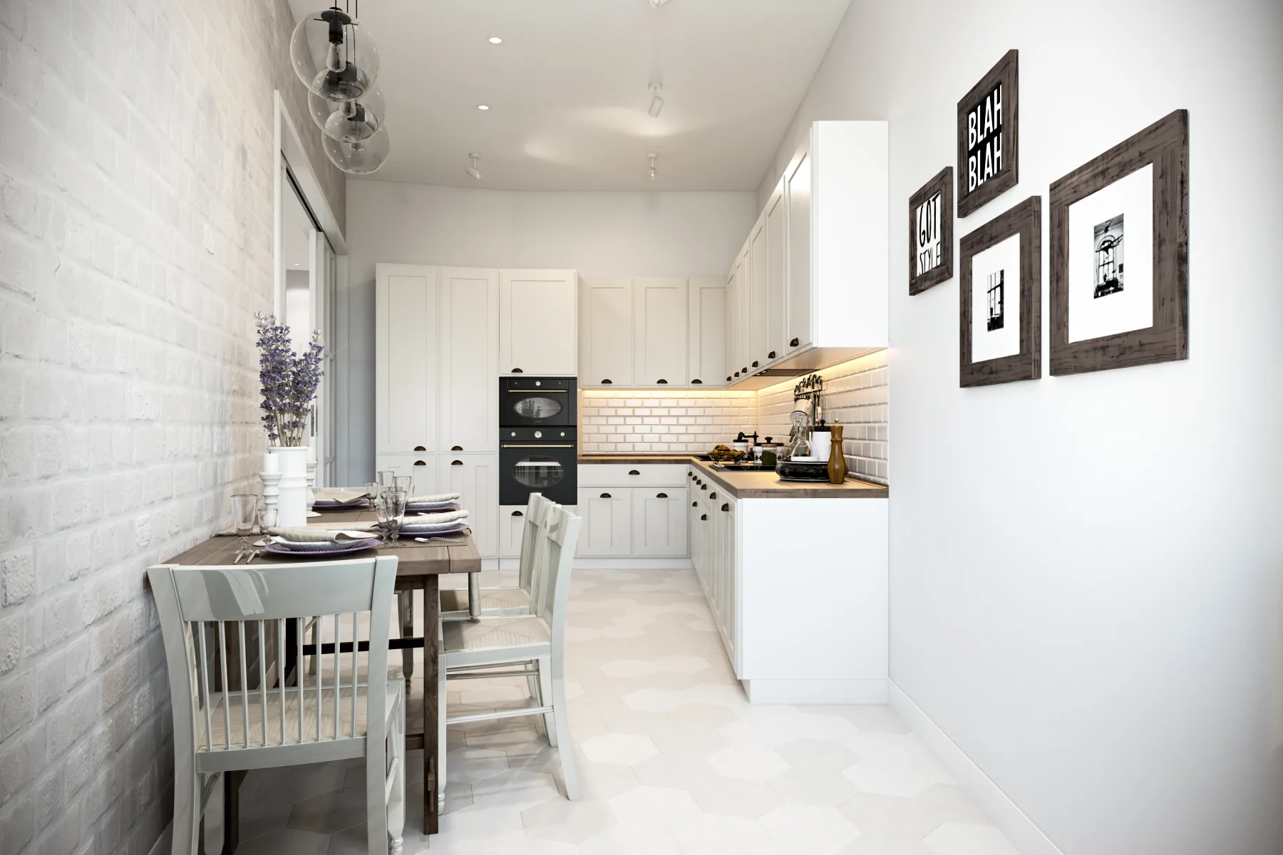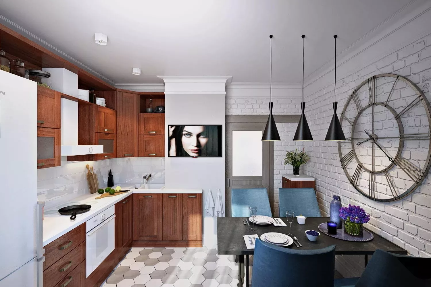 На фото белая стена с имитацией кирпичной кладки на кухне площадью 10 кв метров.