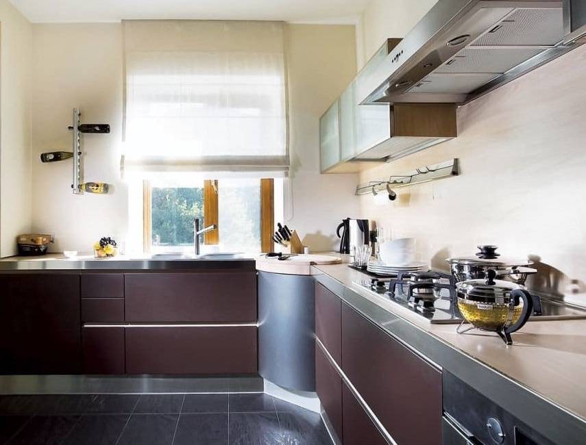Особенность модерна — плавные линии во всех деталях интерьера. При разработке дизайна кухни площадью 10 кв метров нужно отдать предпочтение натуральным материалам.