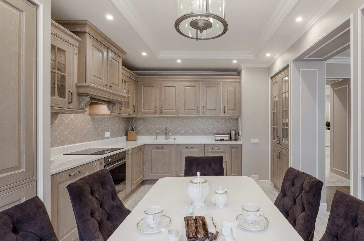 В классическом интерьере предпочтение отдается спокойной цветовой гамме. К отличительным чертам относят симметричность форм, натуральные материалы, элегантные элементы декора и хорошую освещенность. Для оформления стен на квадратной площади используются лепнина или керамика, фасад гарнитура украшается искусной резьбой. Она должна демонстрировать предпочтение владельца, его тягу к классическим веяниям.