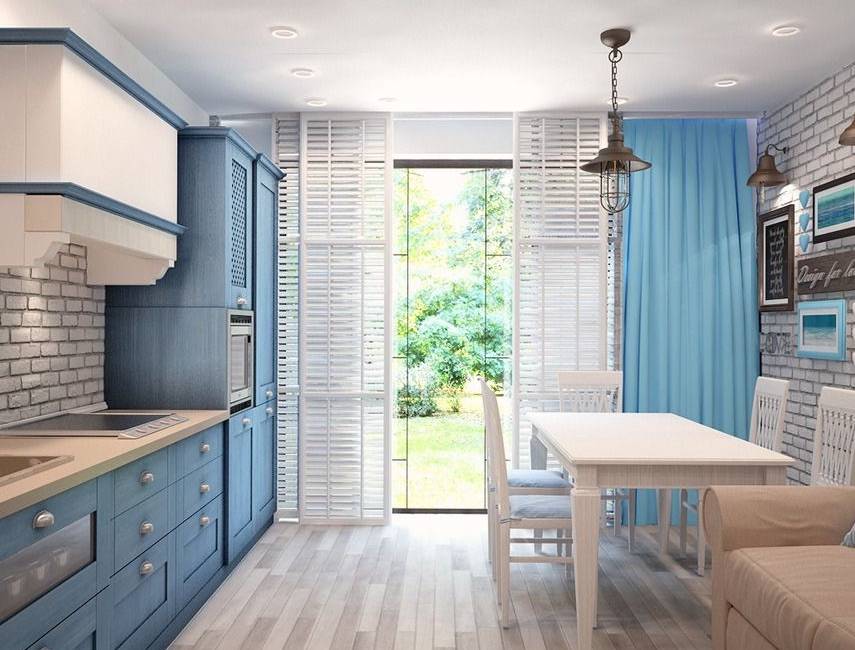 Идея подразумевает сочетание светлых тонов с вкраплениями мягких оттенков голубого. Готовый ремонт должен создавать впечатление неба над южными морями. Пол требует темного ламината, а светло-бирюзовый присутствует в небольших количествах: в расцветке фартука, стола или стульев, занавесок.