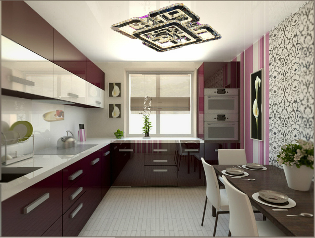 Правильный и целостный образ восполняют источники освещения, из которых главная роль принадлежит изящной и воздушной подвесной люстре из пяти хрустальных шаров. Добавочный свет дают встраиваемые светильники, раскиданные по подшивному потолку. Зона для работы подсвечивается лентой дюралайт.Красочная облицовка допускает применение очень маленького украшения интерьера: это маленькие картины, размещенные на входе в кухню и на лоджию, белые воздушные занавеси и темно-серые шторы.