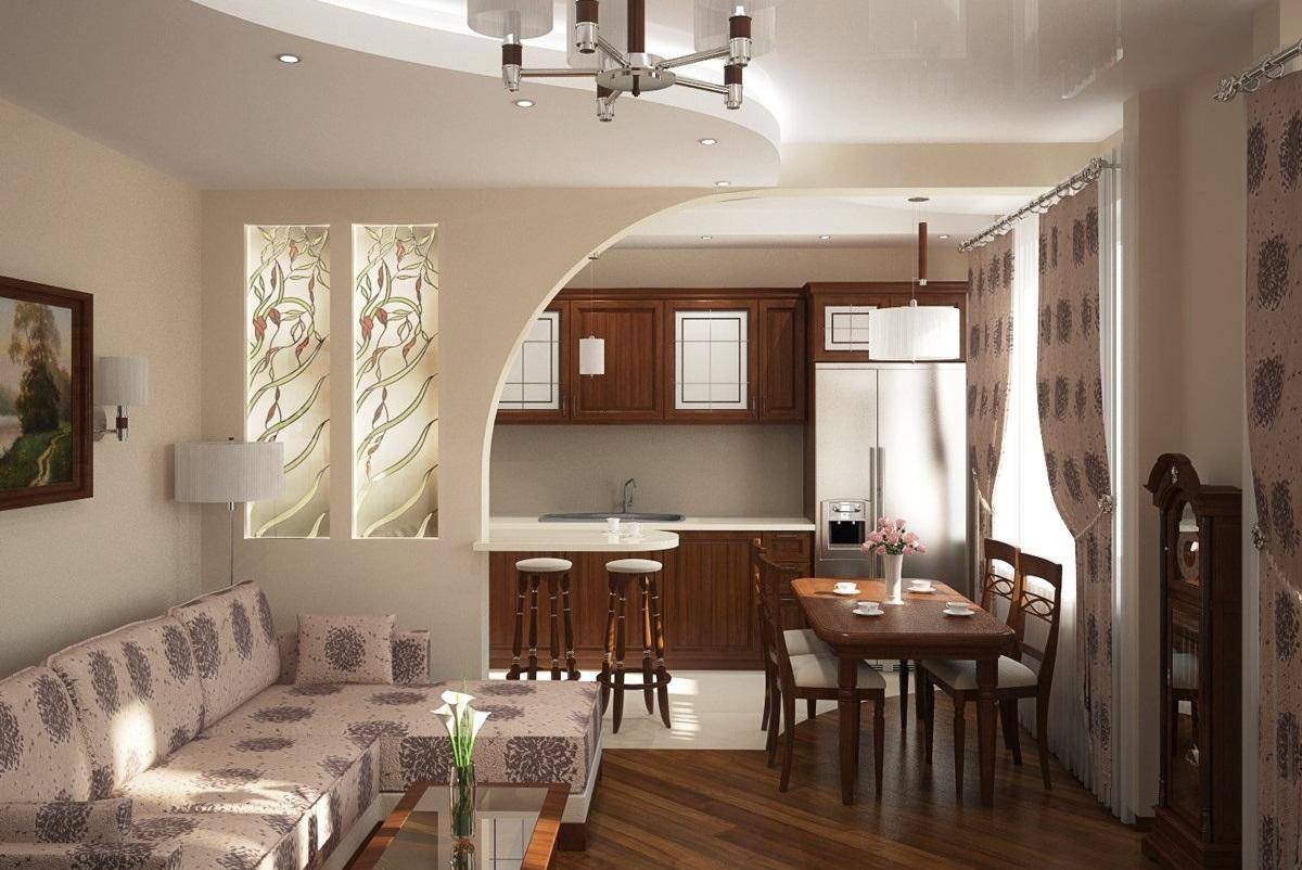 Один из самых простых вариантов – возвести арку из гипсокартона между кухней и гостиной, как показано на многочисленных фото. Этот материал считается самым дешевым. Достать его просто: вам достаточно просто посетить любой оптовый рынок стройматериалов в своем городе.