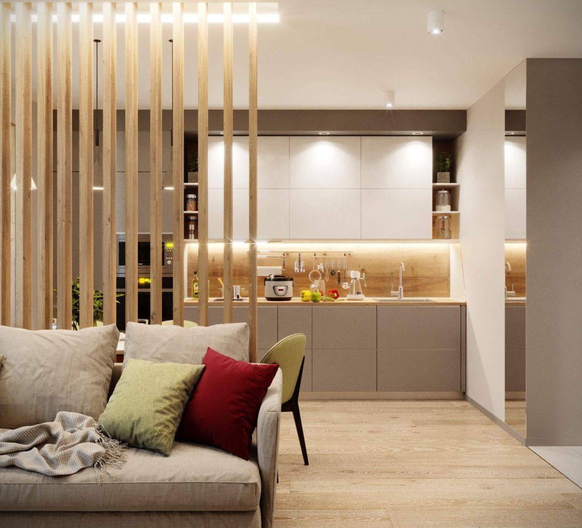 Если кухня и гостиная оформлены в современном стиле, для разделения пространства лучше всего использовать функциональные перегородки. Их можно оборудовать биокаминами и полками. Если сделать перегородку того же цвета, что и стены комнаты, визуально она не будет утяжелять пространство и перегружать пространство.