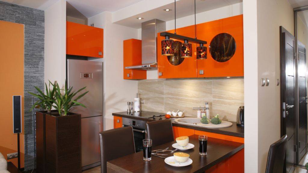 Любой дизайн оранжевой кухни нуждается в фокусе для ее декорирования-акцентной стене или эффектной бытовой технике, которая преображает скучные интерьеры.