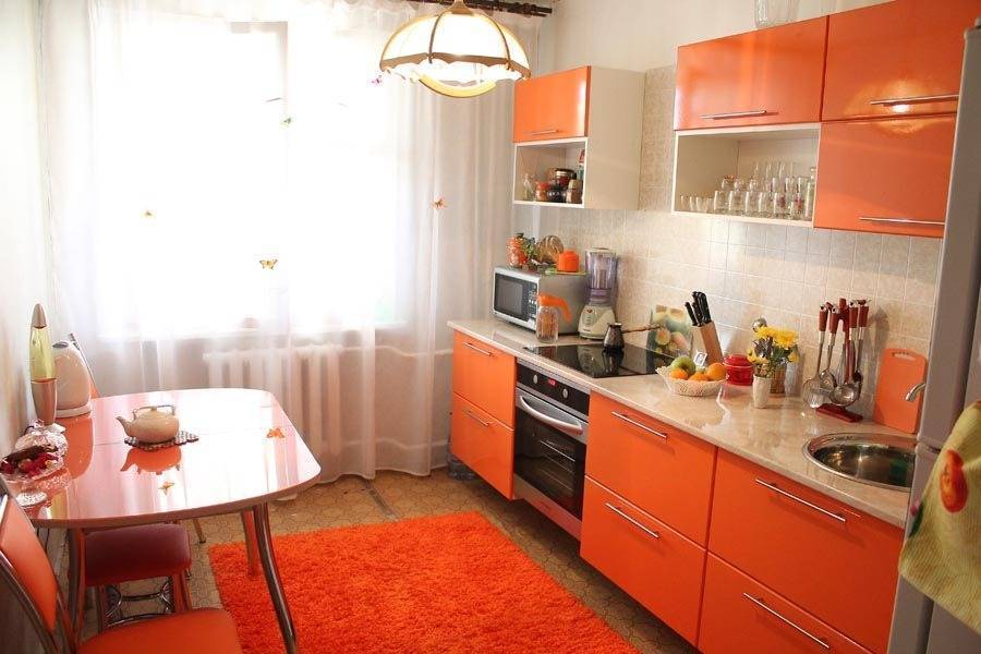 Золотой, оранжевый или коралловый цвет можно использовать в любых элементах кухонной обстановки и декора: