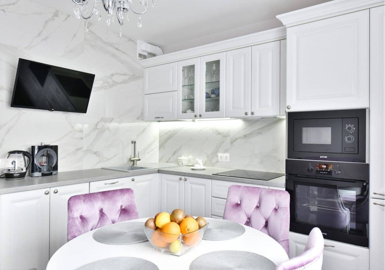 Кухня светлых тонов с фиолетовой столешницей — элегантное решение, хороший пример грамотно расставленных в жилище цветовых акцентов. В фиолетовом цвете можно обустроить рабочую поверхность и установленный в центре обеденный стол. Стоит также использовать несколько декоративных элементов фиолетового цвета.