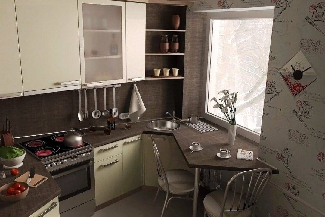 Мебель должна также соответствовать размерам кухни. Сюда подойдёт складной вариант гарнитура – быстро раскладываемые стулья, стол-трансформер, небольшой угловой шкаф. Все элементы должны быть продуманы и максимально эргономичны.