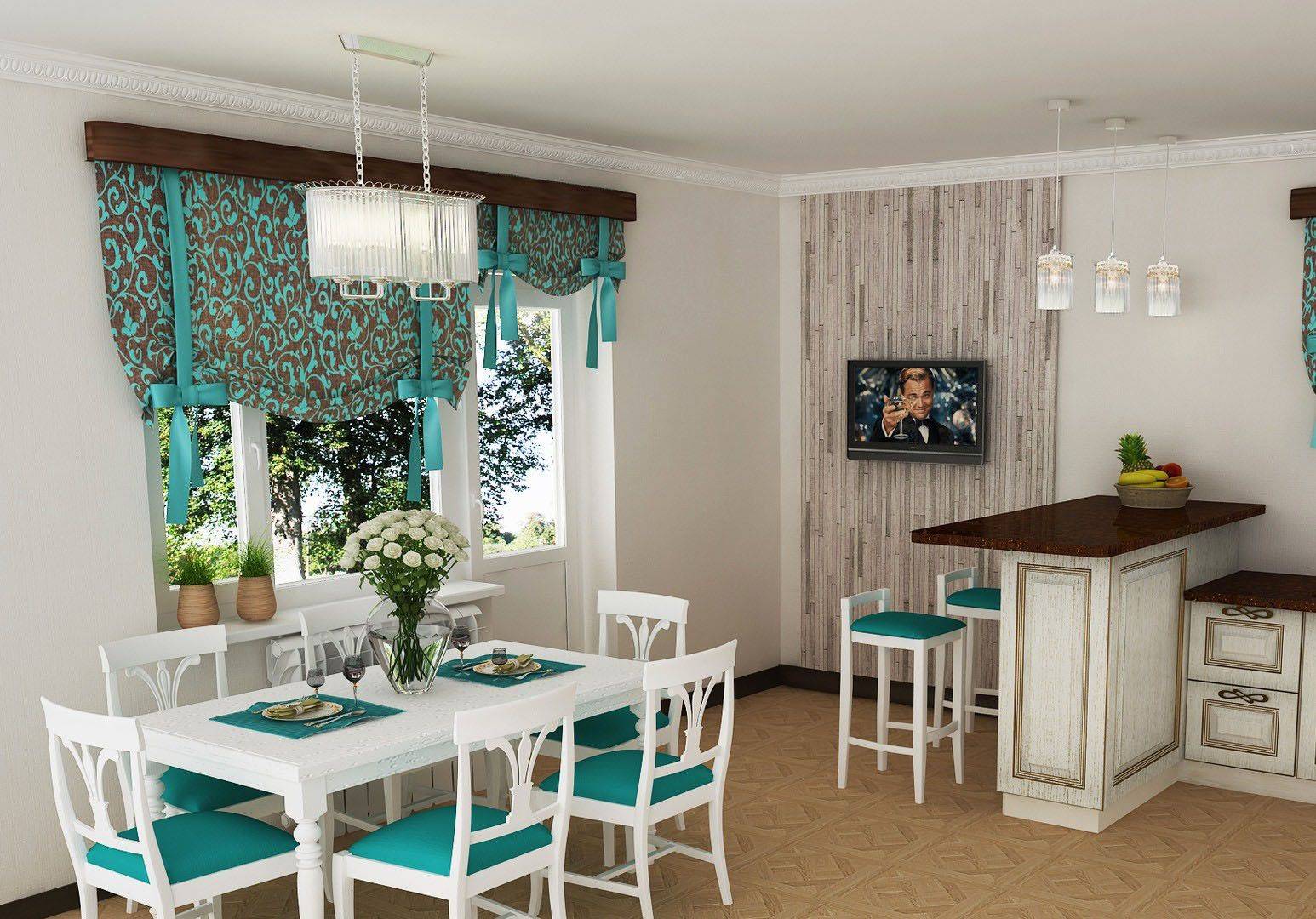 Если интересует, как красиво повесить шторы на кухне большого размера, то ответ – как угодно. Столовые с огромной площадью вообще не страдают от цвета. В них главное – соотношение с общим дизайном интерьера.