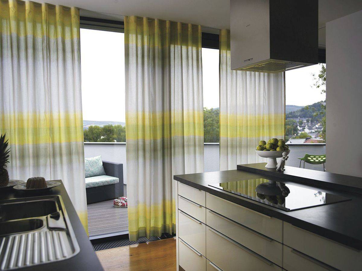 - Различная длина изделий. Особенно хорошо сочетание выглядит на кухнях, имеющих выход на балкон.