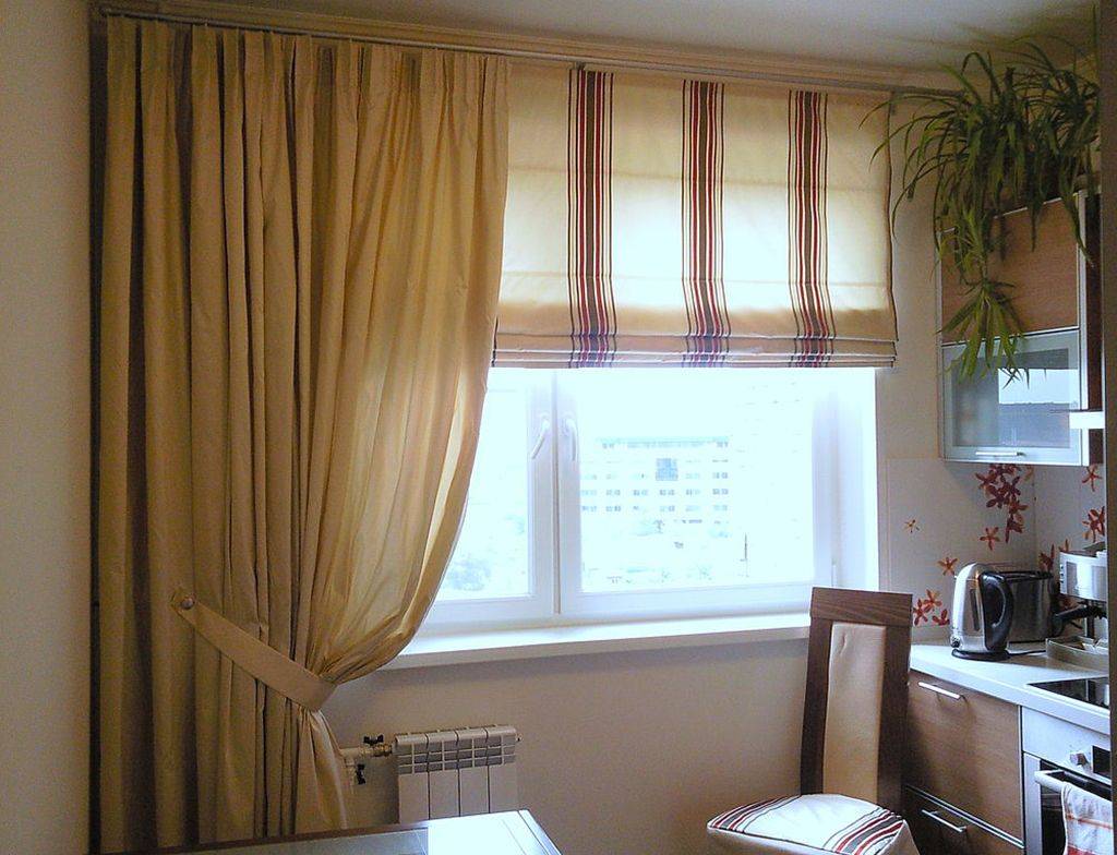 Занавески на кухню, состоящие из 2 и более тканей. Выглядят свежо, особенно с подачи хорошего дизайнерского вкуса.