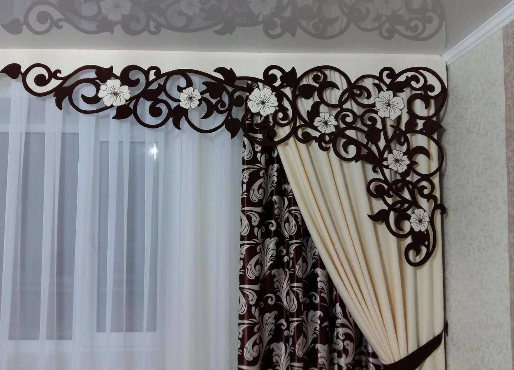Ажурное бандо — отличный способ украсить карниз для штор своими руками, оно скрывает карниз и смещает визуальный акцент на сам занавес, что позволяет использовать для крепления штор дешевые пластиковые профили и не переплачивать за декоративные изделия с художественной ковкой и дорогостоящими аксессуарами.