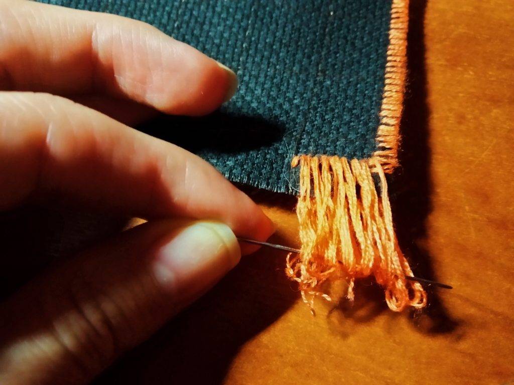 Важно, чтобы по краям работы вы не забыли оставить запас канвы. Верхнюю и нижнюю границы прикрепите к деревяшкам, сверху приклейте шнурок или ленту