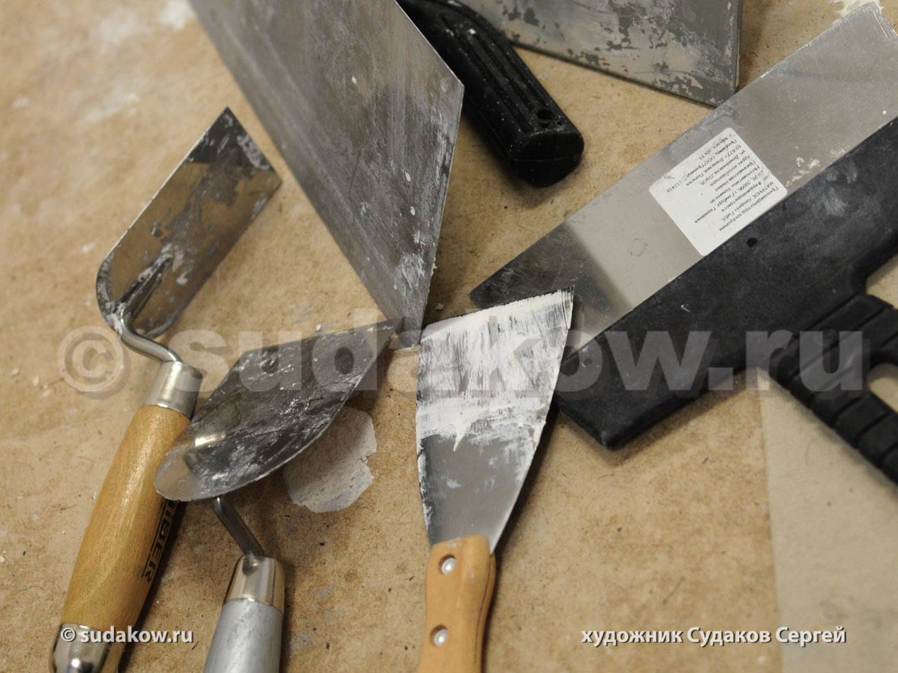 Один из инструментов, которые применяются в работе над рельефом из штукатурки – это шпателя. Бывают разных размеров и видов.