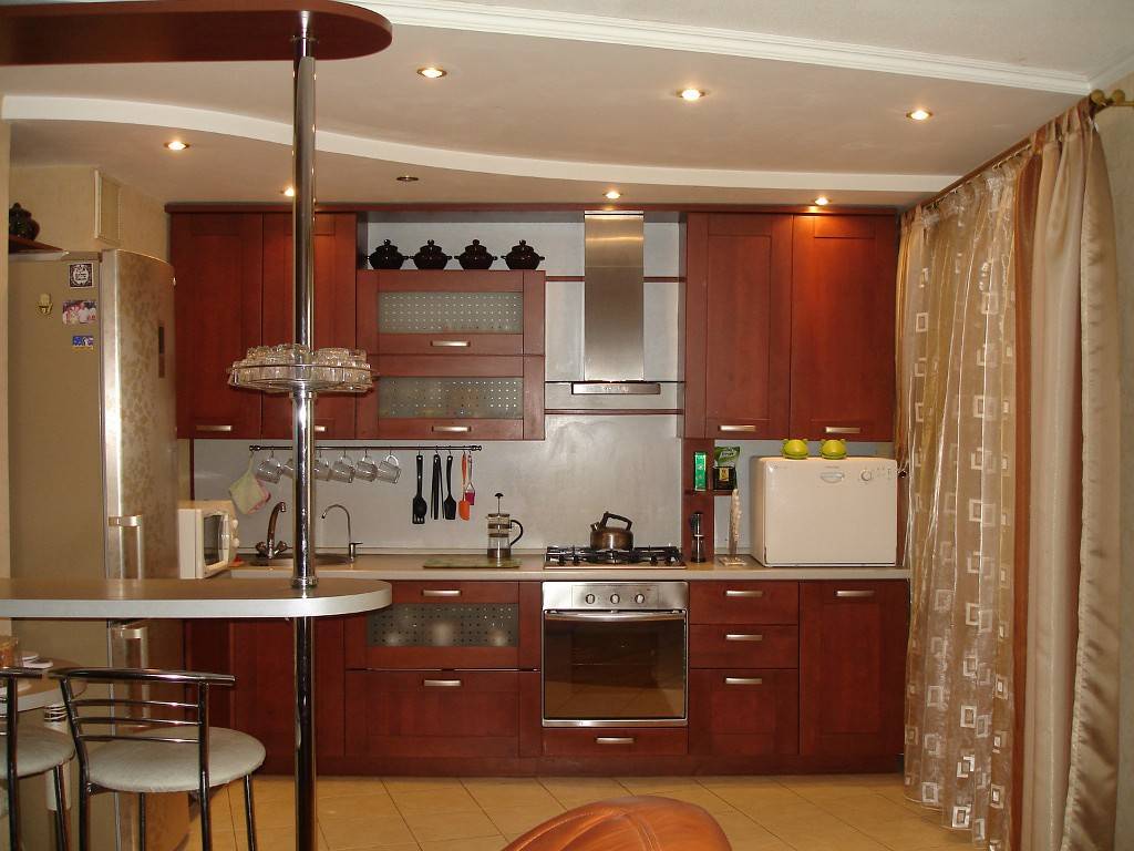 - стойка, расположенная вдоль стены, – вариант для крошечных кухонь, в т.ч. в хрущевках.