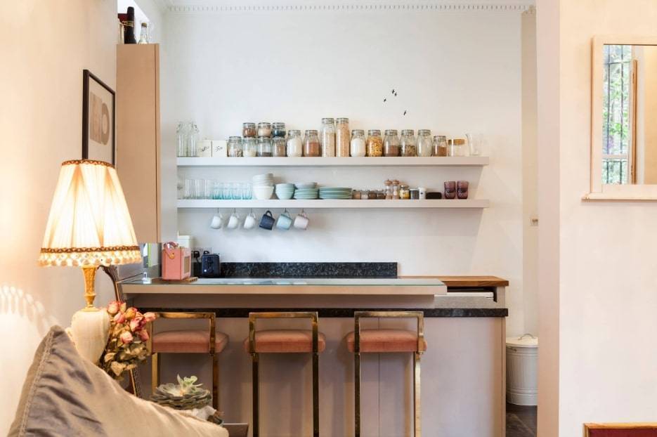 - откажитесь от верхних шкафчиков в пользу открытых полок, расставив на них чашки, бокалы, элементы декора;
