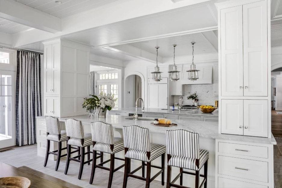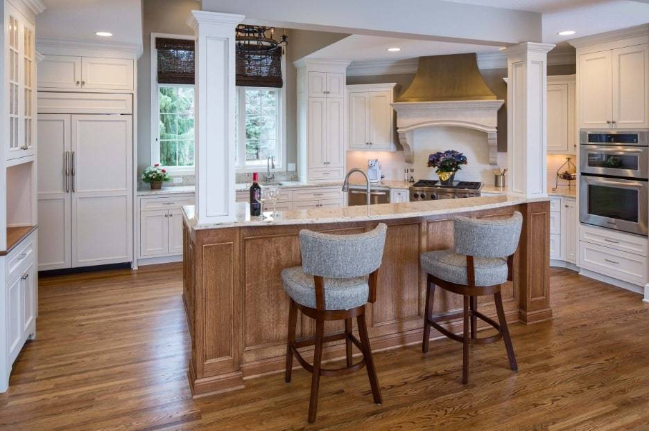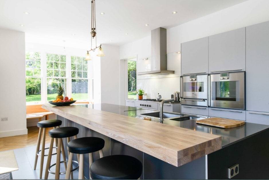 С одной из сторон кухонного острова обустроена барная стойка