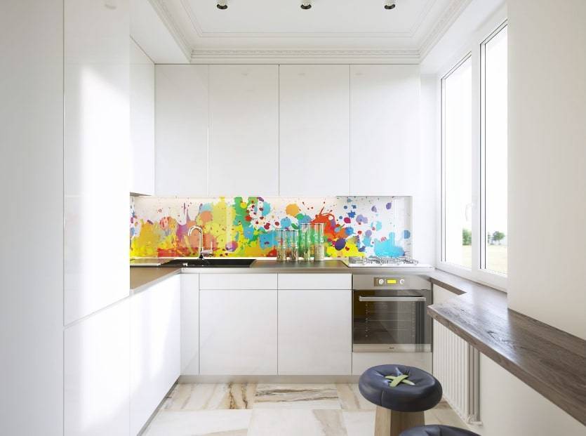 Выбор изображений достаточно широк – это может быть как фото мегаполиса, так и цветы, овощи или фрукты, абстрактные композиции, а также укладка в шахматном порядке. Узоры могут перекликаться с рисунками на обоях, шторах или текстиле.