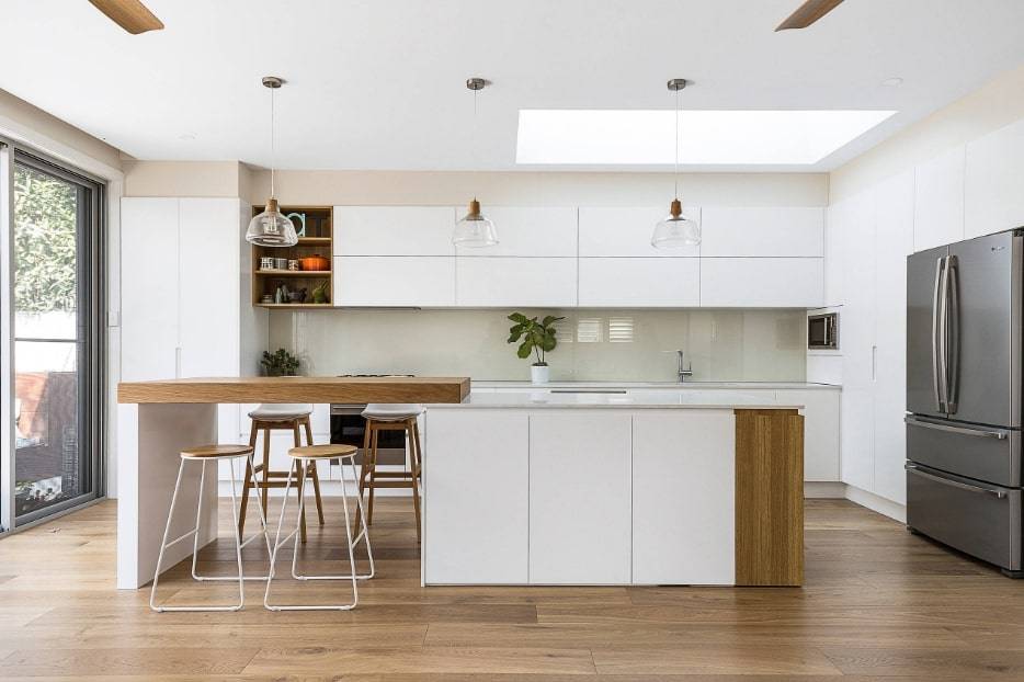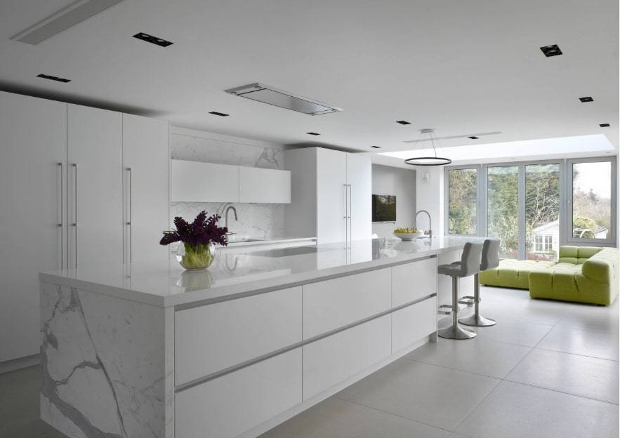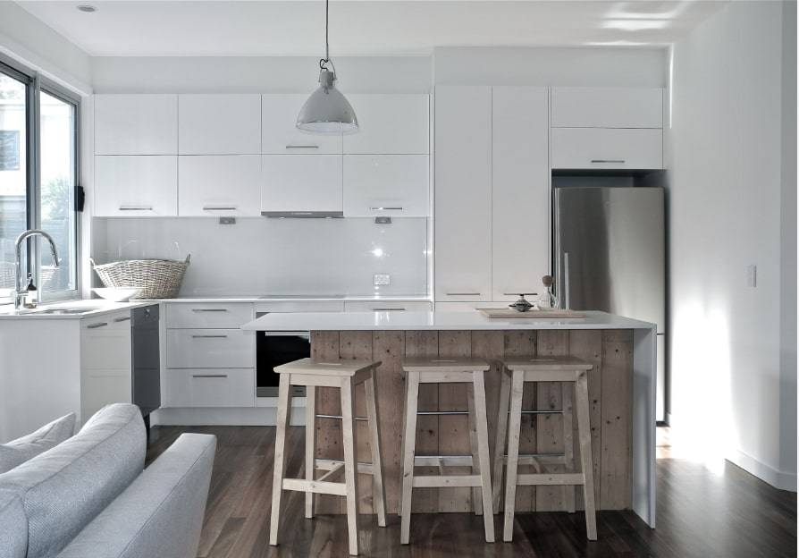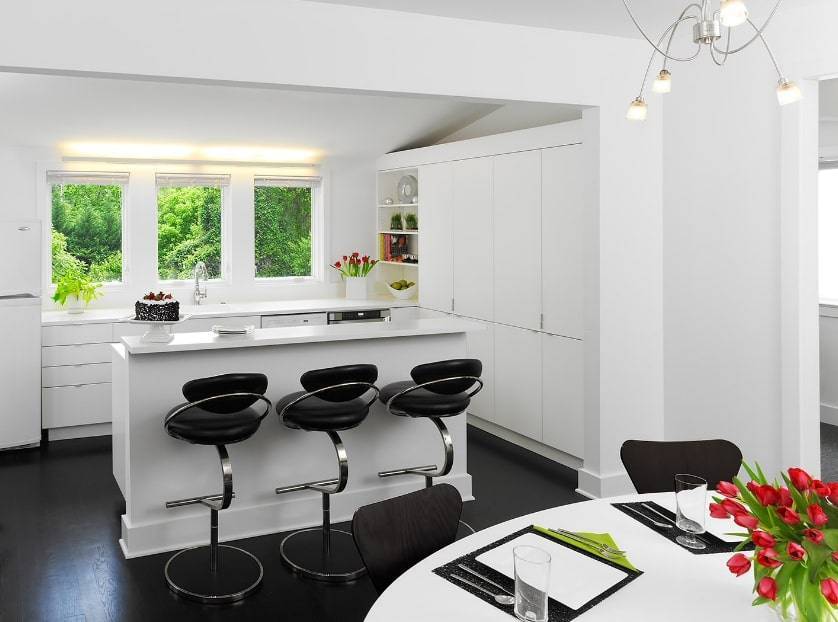 Покрытие пола в этом случае не рекомендуется делать белым, иначе композиция сольется в единое пятно. Белый низ кухни – это практично, так как на таких поверхностях менее заметны следы от пальцев и разводы от воды.