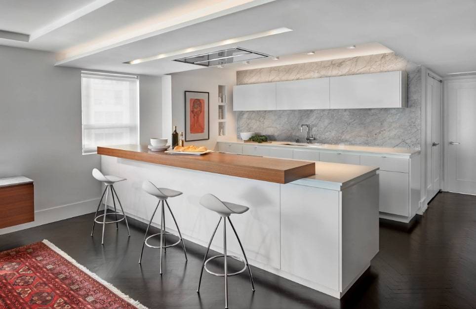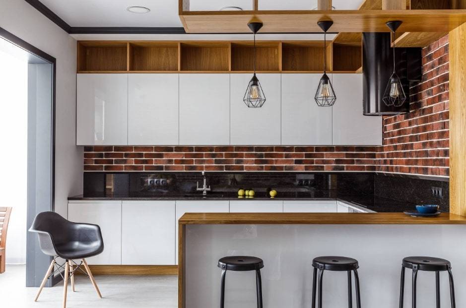 Сперва может показаться, что на кухне, где и так практически нет свободного пространства, барная стойка станет лишней и неуместной, однако это вовсе не так. На маленькой кухне она является своеобразной находкой, также идеально подойдет для людей, проживающих без детей или же для тех, кто живет один. Этот элемент интерьера может использоваться и как обеденный стол, и как барная стойка для вечерних посиделок с друзьями за вкусными коктейлями.