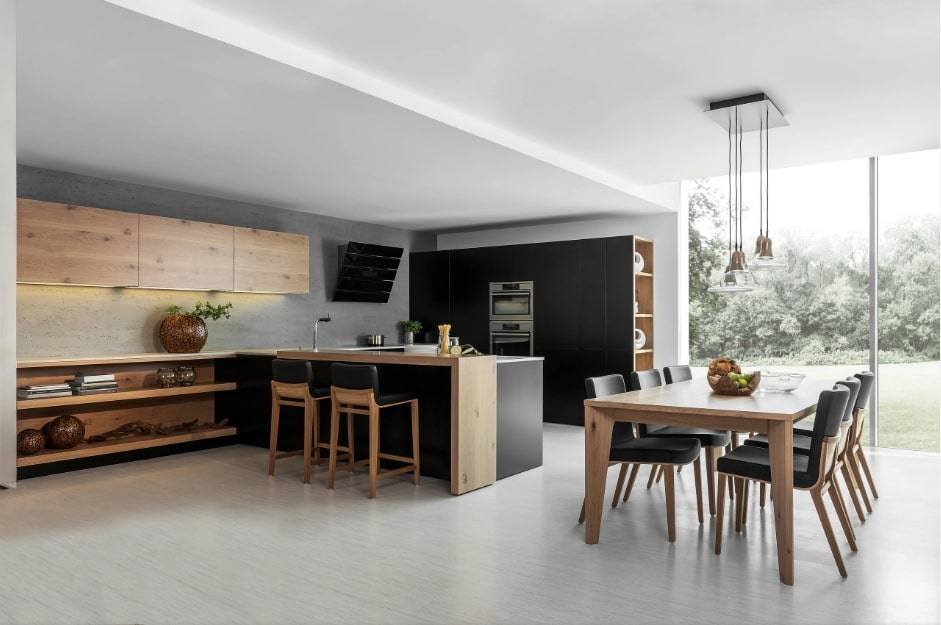 Кухня-гостиная с барной стойкой черного цвета