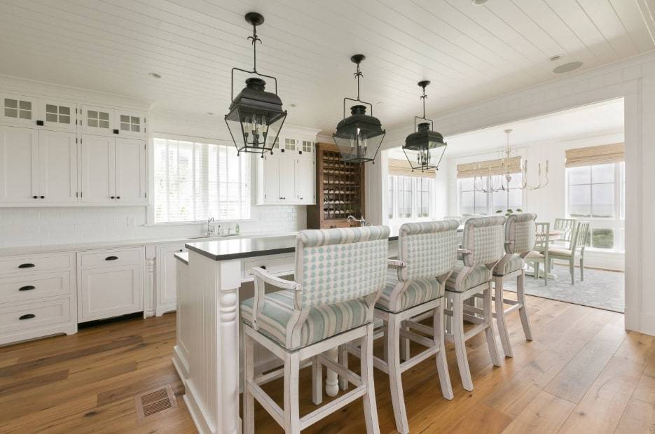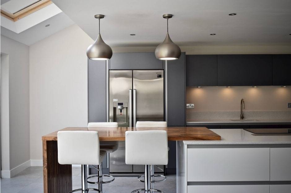 - свисающие низко потолочные люстры над обеденным столом и барной стойкой;