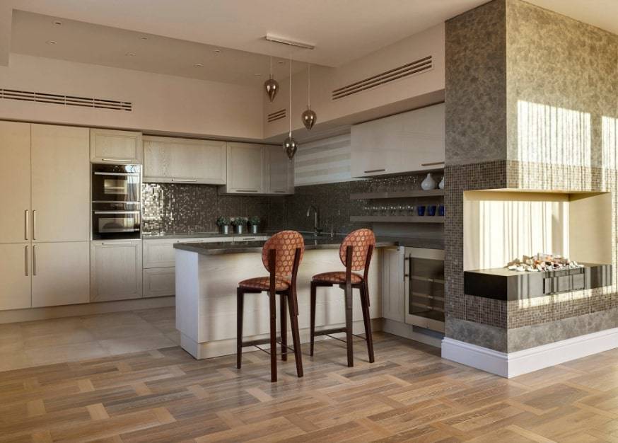 Желательно, чтобы она захватывала и зону кухни, и гостиной. Идеально, если это будет стена, на которой располагается окно. Под ним можете соорудить рабочую поверхность, плавно переходящую в перпендикулярно стоящую барную стойку.