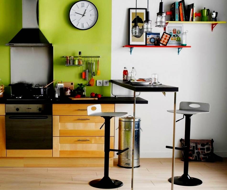 В большинстве случаев это просто столешница. Продольная часть закругленная и касается стены. Подвешивается на высоте 1,1 м от пола. Можно приобрести комплект с высокими стульями. При изготовлении используется материал, который стойко переносит повышенную влажность и не остаются следы от горячей поверхности (чашек, тарелок). Огромный выбор представлен в магазине ИКЕА. Там можно найти самые хорошие дорогостоящие изделия и бюджетную продукцию из ДСП, покрытую пластиком.