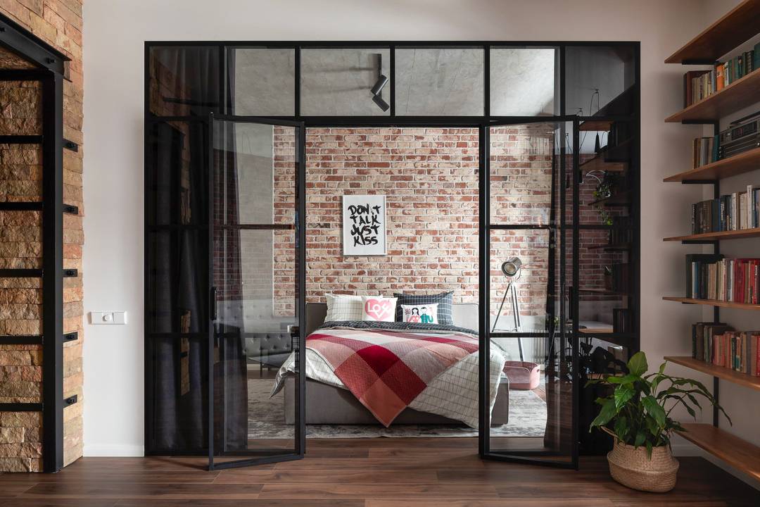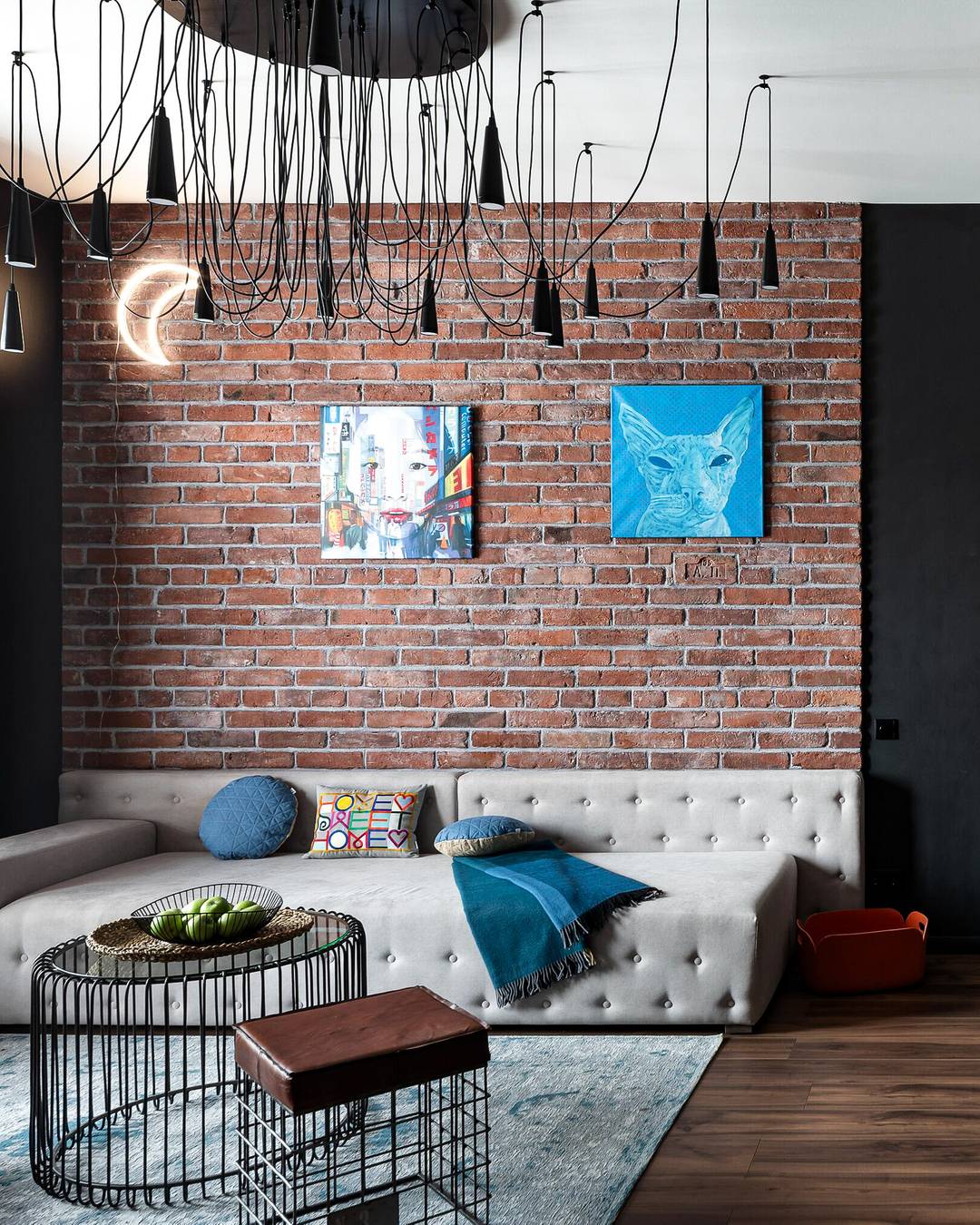 Главной отличительной чертой лофта является открытая кирпичная кладка. А в новом панельном ЖК, в котором размещена квартира, кирпича, конечно же, не было. Поэтому для оформления стен использовался настоящий старинный кирпич 1800-х годов. Перед укладкой на стены, кирпич нарезали плиточкой. На стене гостиной его очищали и покрывали лаком. При укладке в спальне на кирпичах сохранили “налет времени”.