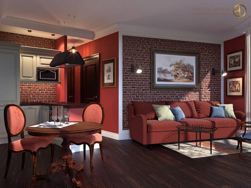 Недопустимый вариант при планировании дизайна совмещенного пространства. Даже по фото видно, что для осуществления полноценного проекта понадобится гораздо больше пространства, так как этот стиль имеет много деталей и дополнительных элементов.