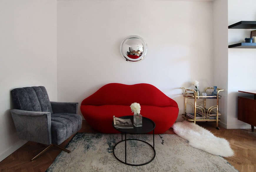 - Сочетание красного и белого – элегантность белого подчеркивает сочность красного, но вместе создается интересный и красочный дизайн интерьера. А про сочетание розового и серого в интерьере можно прочитать тут.