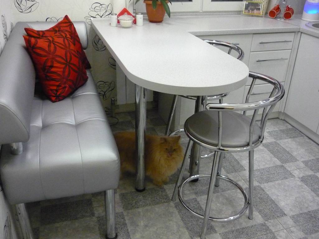 В большой кухне можно поставить не полноценную, а маленькую, представляющую собой выступающую часть столешницы. В маленьком помещении такой прием окажется неудачным, ведь это разделение одной небольшой поверхности на две меньшие – готовить будет неудобно. Большое пространство позволяет поднимать одну часть стола и менять ее функционал. Получается своеобразное зонирование: территория, где едят, отделяется от предназначенной для готовки.