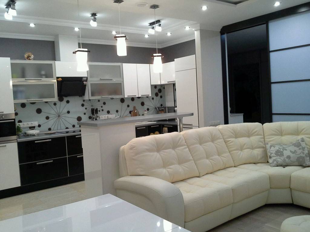 Кухня-студия подразумевает минимализм в деталях и удобство. Предпочтительно использовать высокую мебель, поставить для зонирования бар. Открытая планировка визуально делает помещение просторным