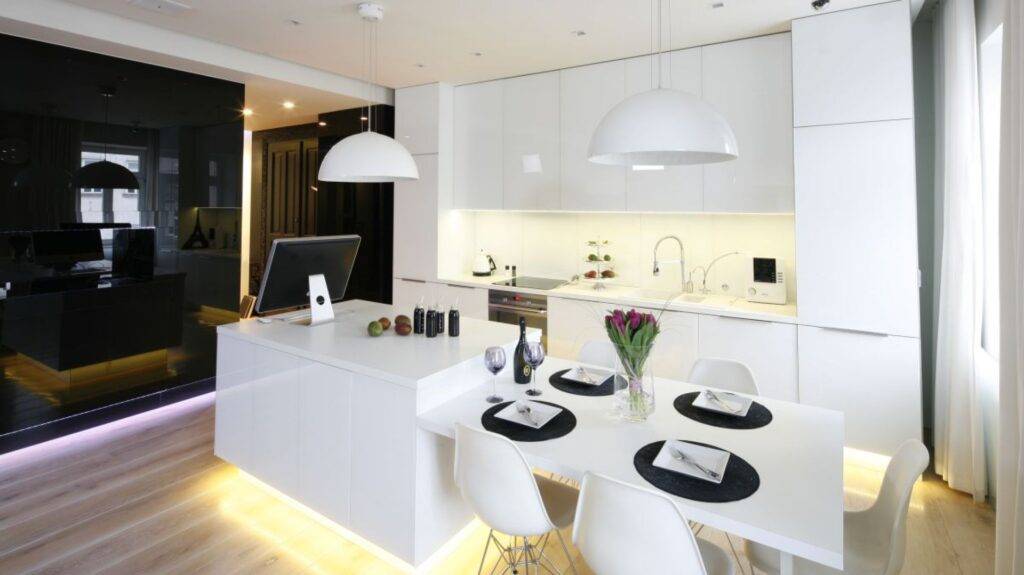 На такой кухне ключевым также являются стулья, которые следует правильно подбирать по высоте столешницы. Здесь очень популярны круглые сиденья из металла. С другой стороны, со стороны приготовления напитков на столешнице должны быть все инструменты, которые позволят спрятать стаканы, ножи и даже бутылки и раковину от глаз гостей. Уместна будет встроенная кухня, но при условии, что она подходит идеально.