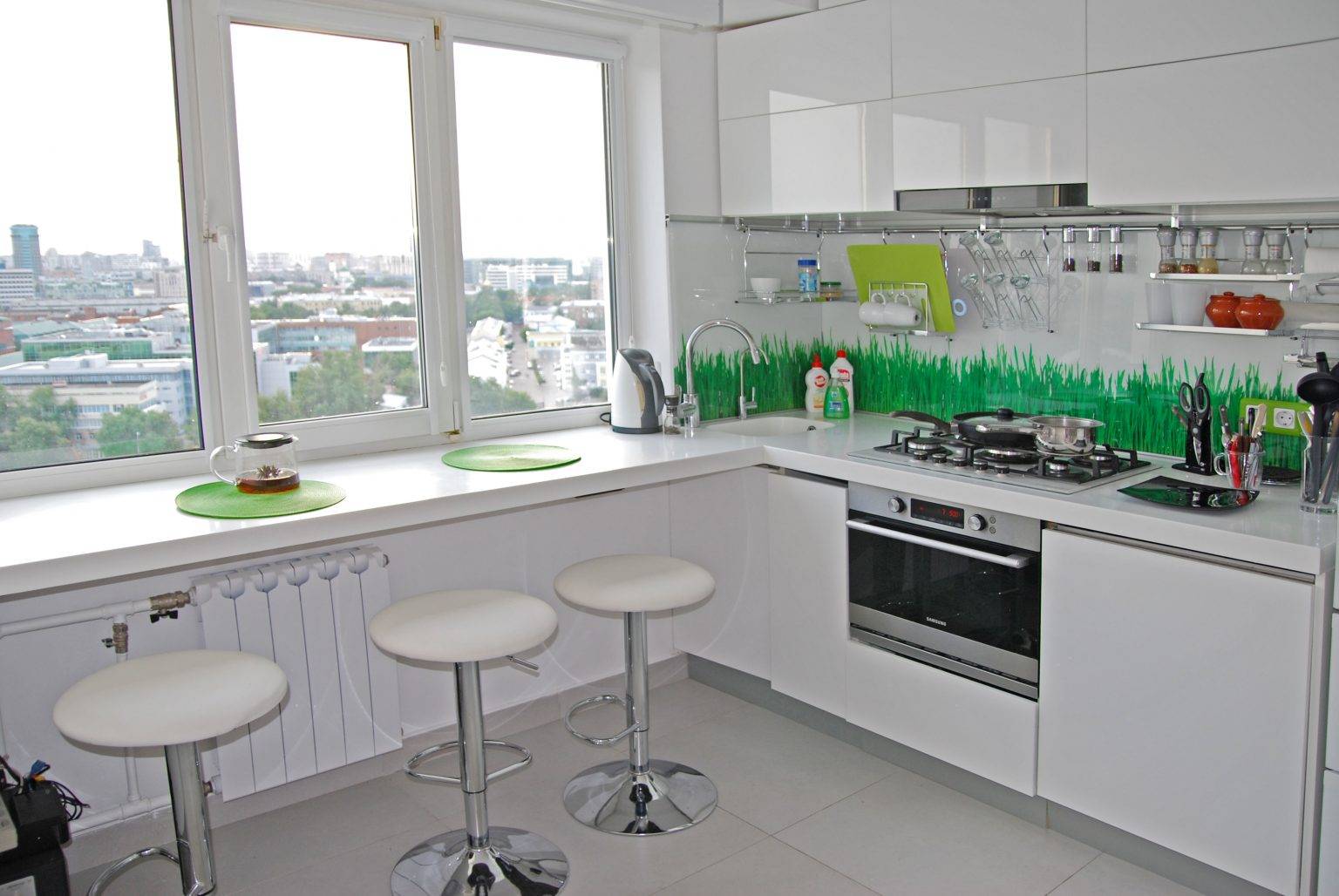 - Высота подоконника должна быть 85-90 см или выше. Только тогда возможно установить нижний ряд кухонного гарнитура вровень с подоконником или немного ниже него, но не нарушив конструкции окна.