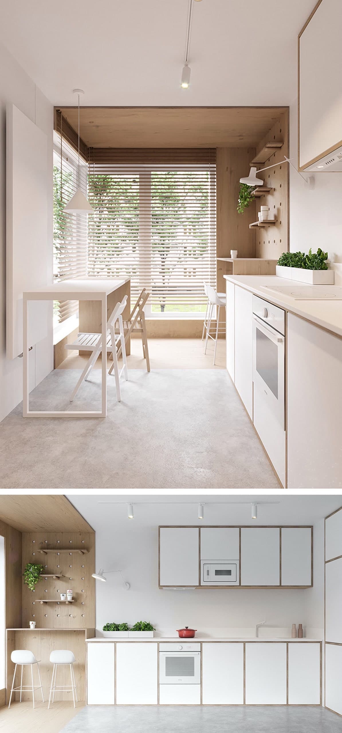 Несколько вариантов оформления светлой кухоньки с деревянной рабочей столешницей: