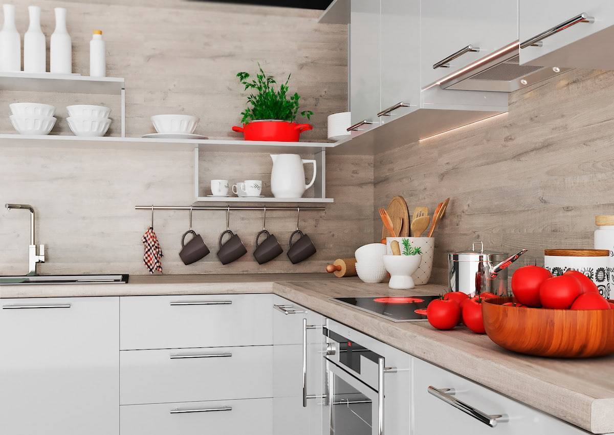 В оформление белой кухни со столешницей под натуральное дерево должно входить несколько цветов, в идеале достаточно три оттенка