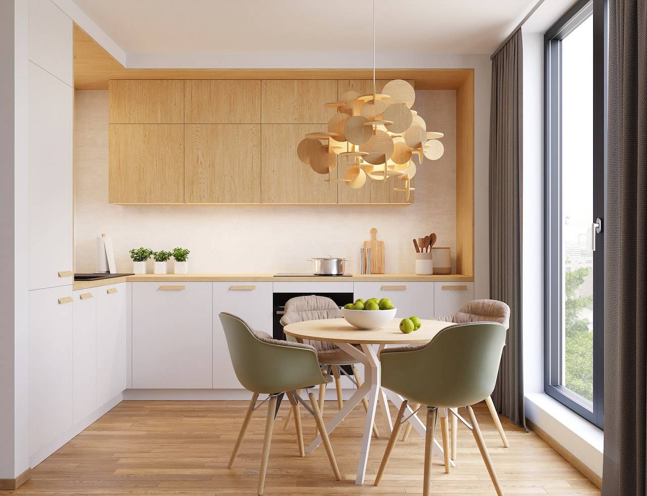 Одним из популярных решений является белая кухня с деревянной столешницей. Такое сочетание характерно для разных стилей оформления интерьера.