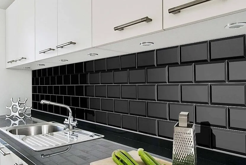Для таких вариантов отлично подойдет кладка небольших плиток кафеля с имитацией кирпичной стенки. Насыщенный черный или угольный глянец фартука можно сделать выразительным. Для этого замазывают швы белоснежной затиркой. Со стороны такой кафель смотрится изящно, рельефно и необычно.