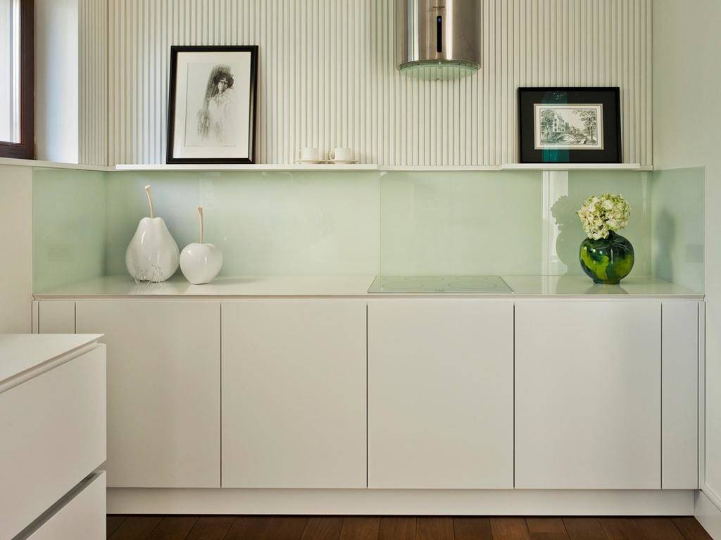 Например, белая кухня с серой столешницей из стекла или пластика, разбавит интерьер, если только белый для вас слишком скушен.