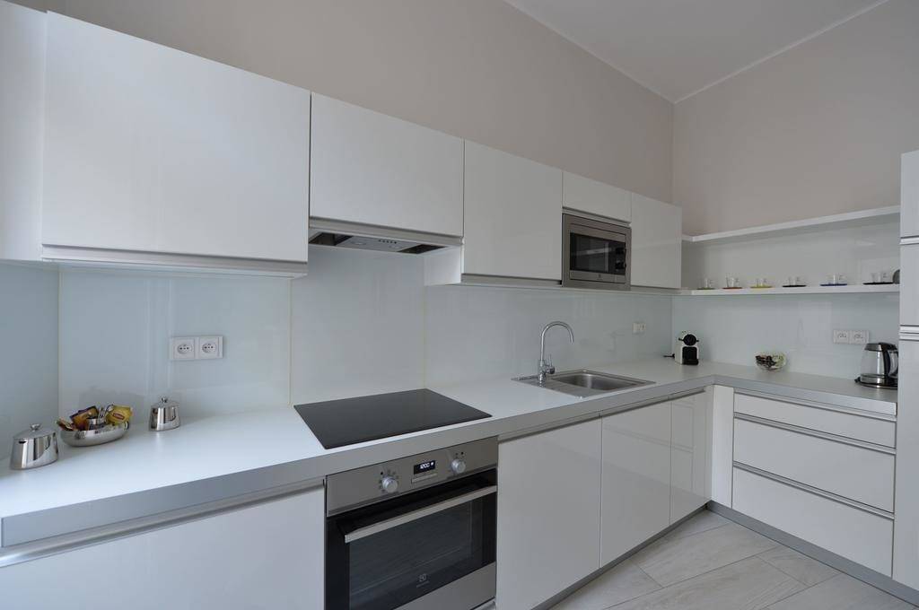 Особенность модерна – это глянец, который блеском создает ощущение большой освещенности. Белая кухня с белой столешницей будет лучше всего отражать световые лучи, создавая эффект глубины и простора.