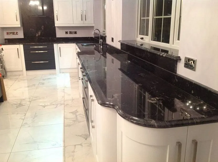 Чёрные столешницы отлично сочетаются с белыми и древесными текстурами.