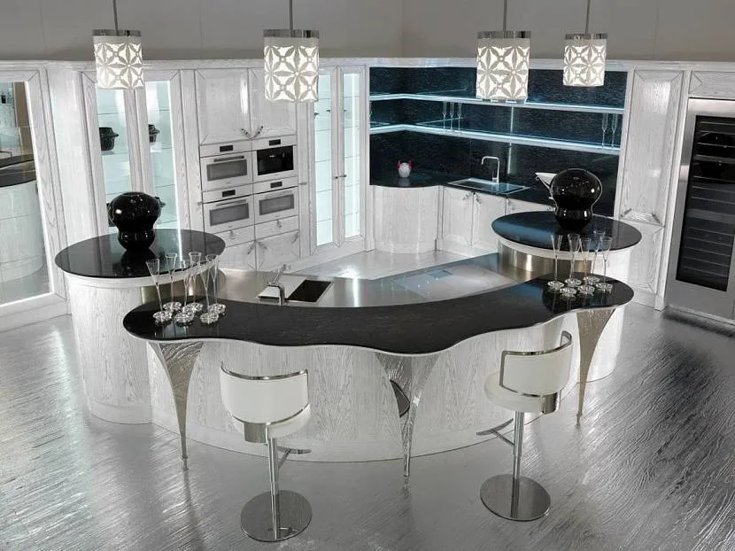 Желательно, чтобы такая кухня была достаточно большой. Белый цвет сделает ее еще более просторной, наполнит светом и сиянием. Ярких цветов в оформлении интерьера лучше всего избегать, отдавая предпочтение приглушенным натуральным оттенкам с металлическим блеском.